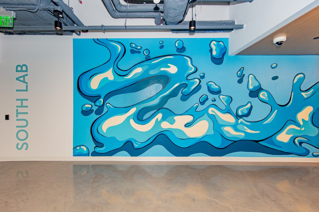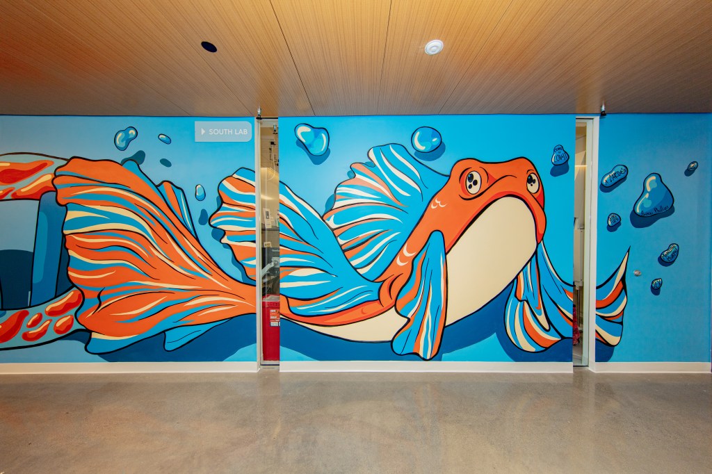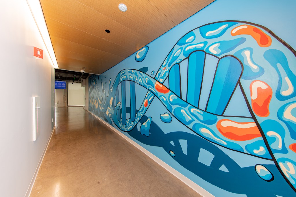 The mural, situated on the third floor, was inspired by the floor’s theme of water, symbolizing its foundational role as the building block of life. The design concept reflects the fluidity and interconnectedness of biological systems, drawing a parallel between the dynamic movement of a double helix and the graceful flow of fish through water. The color palette was carefully selected to complement the building’s interior design, creating a cohesive and thought-provoking visual experience. This project was commissioned by LLMDesign for CRISPR Therapeutics.