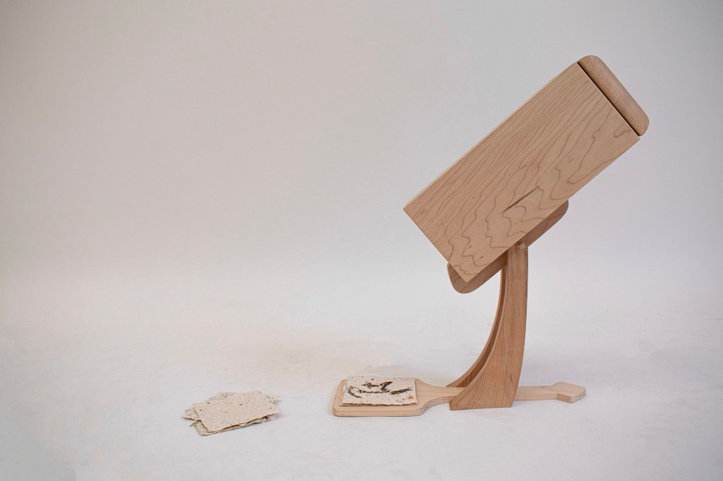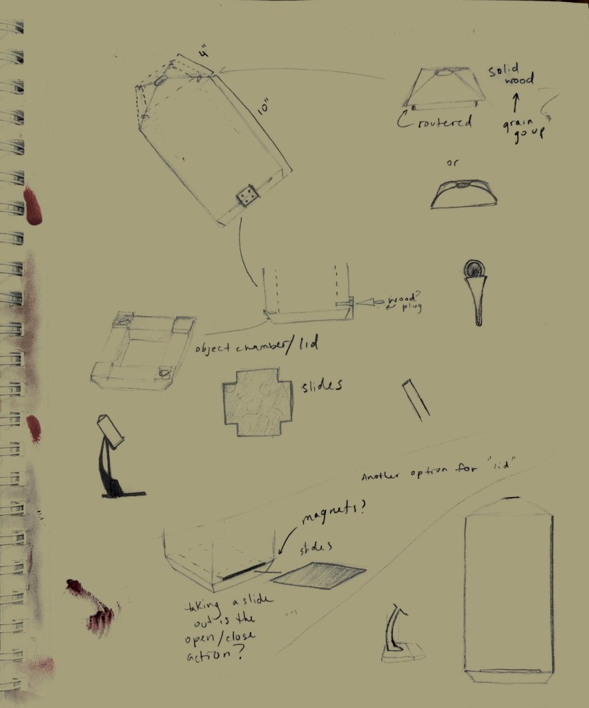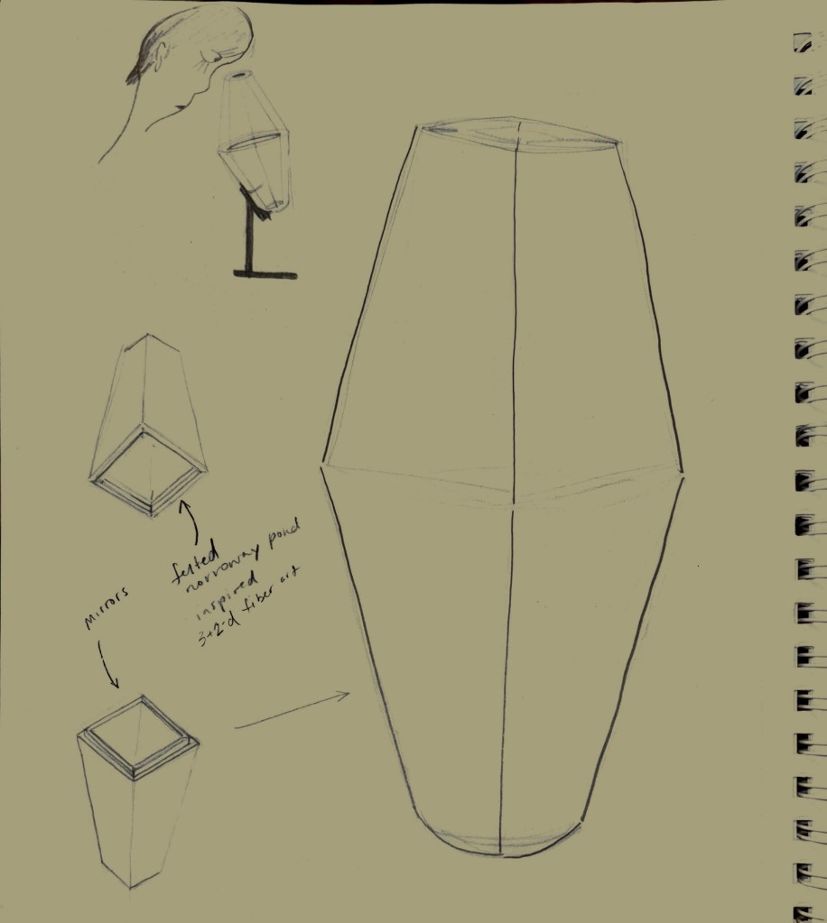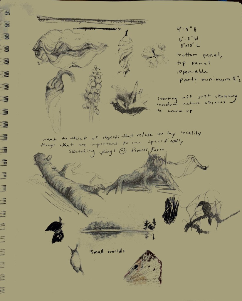 Claire looked to microscopes and telescopes in designing the form of the kaleidoscope box and stand. Collecting leaves, dirt, cattails, algae, daisies, and duckweed from Powers Farm, she made paper slides for kaleidoscope viewing.