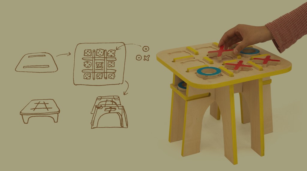 Using Rhino and Autodesk Fusion 360, students in Christopher Speece and Cutter Hutton’s DRAWING FOR FURNITURE – 3D were required to design, mock-up, model, and build a piece of children’s furniture. The flat-pack TIC-TAC-TABLE is constructed with pieces netted into a single sheet of 30″ x 30″ plywood using a CNC router.